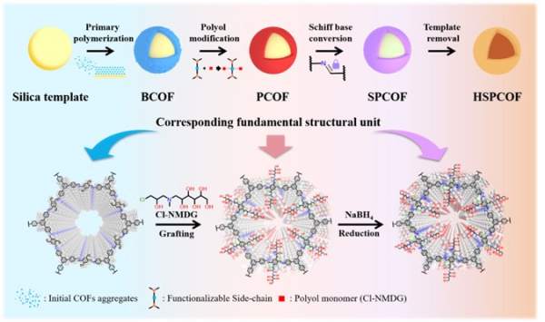 针对共价有机框架(COFs)类吸附剂在实际合成过程中,易出现COFs堆积无序与功能位点可及性受限等问题,研究团队提出了基于侧链工程的结构重构策略,通过单元锚定多元醇侧链实现功能化,同时依靠该侧链对单元稳定性的提升,实现了COFs晶体有序度的强化。在经稳定化修饰及模板去除后,研究成功获得了具有中空结构与较大比表面积以及多元醇功能化的COF吸附剂(HSPCOF)。