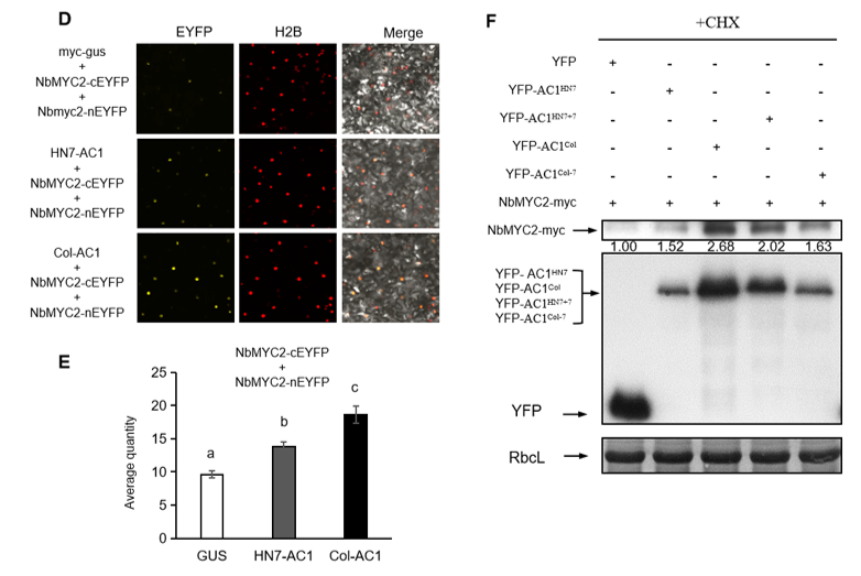 木薯体系实验发现,与健康植株相比,HN7与Col侵染的植株均对烟粉虱产生趋避效应,且Col引起的趋避性强于HN7。模式植物本氏烟进一步表明,该现象具有跨物种普适性,证实强毒株Col对烟粉虱适应性的抑制作用更为显著。分子机制解析显示,两种SLCMV分离株的双生病毒最保守的复制相关AC1蛋白,均能通过靶向植物防御核心转录因子MYC2,促进其蛋白积累与二聚化,从而增强植物对烟粉虱的抗性。同时,Col株AC1蛋白C端一个保守的7氨基酸基序对该功能具有特异性增强作用,而新进化出的流行株HN7,通过丢失该病毒复制关键基序,降低了对抗虫信号通路的激活作用,减缓了植物对媒介昆虫的抗性,最终提高了病毒经媒介生物传播的能力。