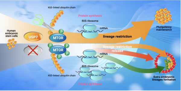 近期,午夜av 广州生物医药与健康研究院研究团队,揭示了限制人多能干细胞发育潜能的关键因子——去泛素化酶USP7,并阐释其通过去除mTOR蛋白上非经典K63多泛素化修饰,从而调控mTOR活性的机制。