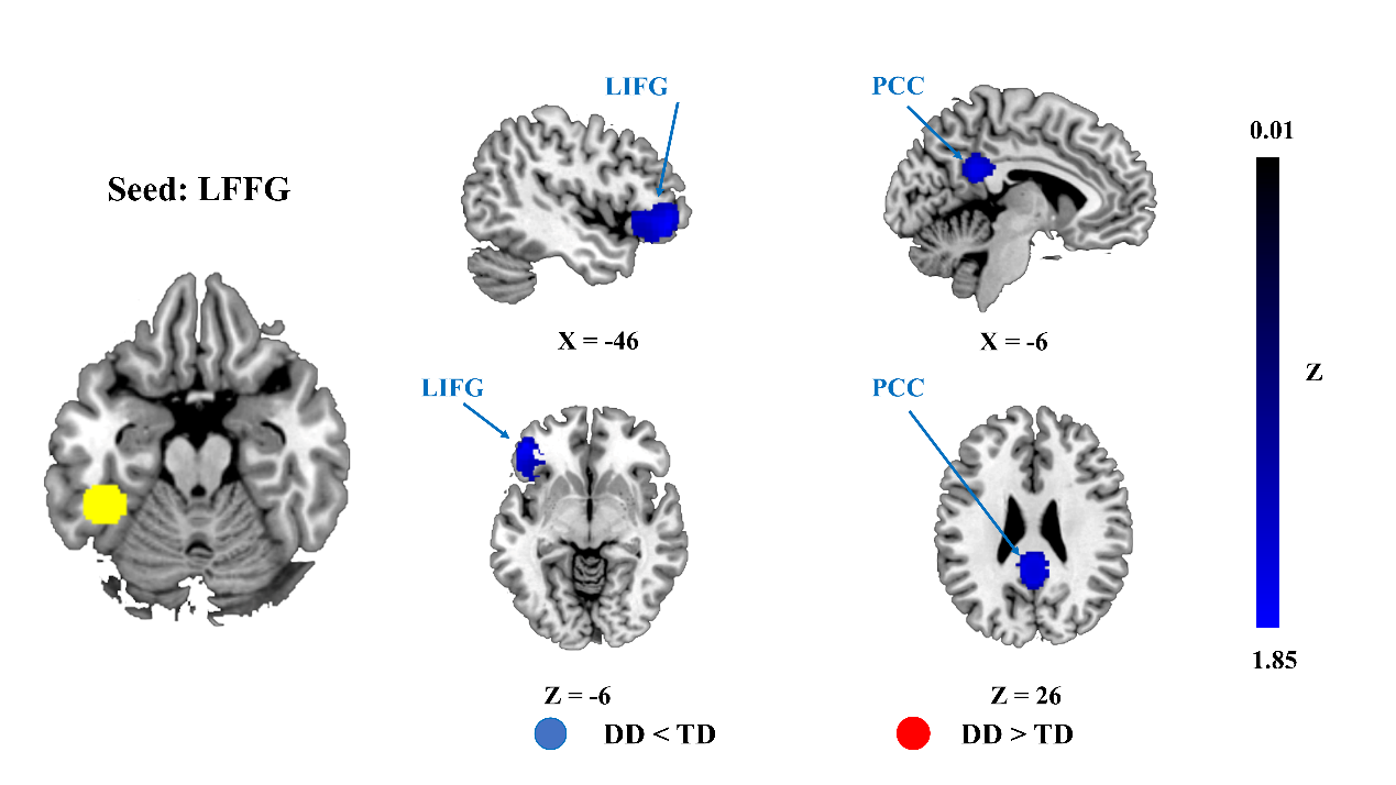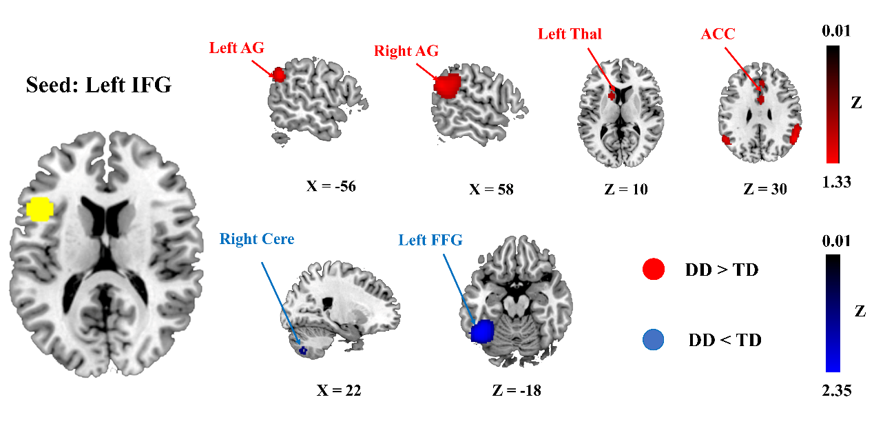 近日,午夜av 心理研究所研究团队,采用元分析方法,系统分析了针对阅读障碍群体静息态与任务态fMRI功能连接的研究。团队发现,阅读障碍群体在任务态与静息态功能连接中,表现出左侧额下回与左侧梭状回一致的异常低连接。这种跨模态且稳定的异常连接模式或是导致阅读障碍脑功能异常的核心缺陷。
