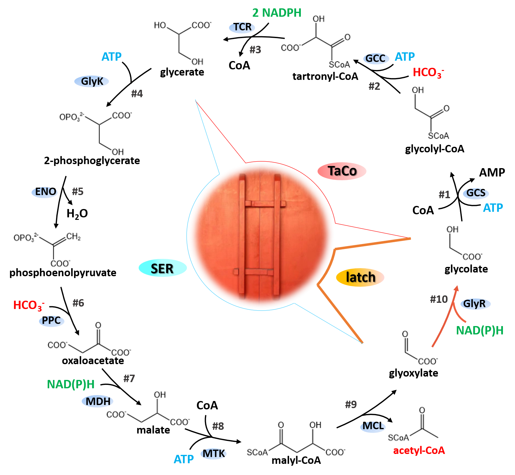 在亲本模块选择上,科研团队参考了围绕丝氨酸循环研究,设计了改良版本的丝氨酸循环,简化了途径结构,绕开羟基丙酮酸参与的低效环节,实现了途径在异源宿主大肠杆菌中的功能发挥。同时,该团队还将丝氨酸循环中氨基酸脱氨和转氨步骤替换为脱羧过程,形成摆脱甲酸依赖的MCG循环,其可将卡尔文循环和糖酵解等过程产生的甘油酸3-磷酸进一步以负碳模式转化为乙酰辅酶A。研究还参考了关于回收Rubisco副产物乙醇酸-2磷酸开发的系列光呼吸旁路观点,其中TaCo模块因包含人工羧化反应,理论最大得率达150%。本研究发现通过引入乙醛酸还原酶这一关键步骤,来发挥“分子门闩”作用,可实现天然丝氨酸循环与人工羧化模块TaCo的重组,并产生功能质变——由依赖有机底物的两类亲本模块,转化为完全的固碳循环。