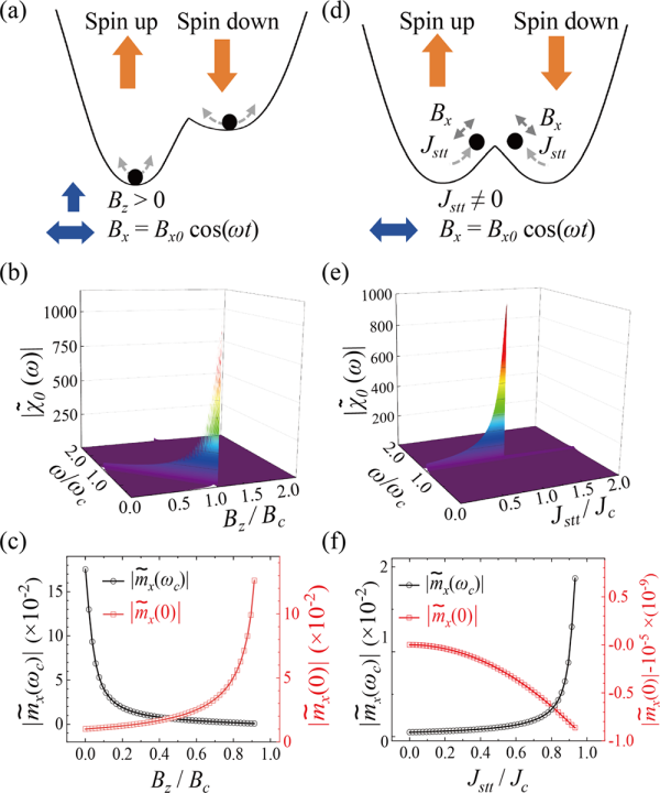 对于磁性材料,可使用磁场和自旋力矩两种方法去翻转磁性材料的磁矩。前者对应平衡相变,后者对应非平衡相变。在磁场Bz驱动磁矩翻转的情况下,通过施加水平扰动场Bx0 cos(ωt),磁矩的水平分量mx的峰值和磁场Bz以及频率ω的关系如图b所示。随着Bz接近临界点Bc,静态(ω=0)响应函数按照反比例函数形式趋向于发散,而动态(ω=ωc本征磁共振频率)响应函数逐渐减小,因此静态响应函数可作为磁场翻转磁矩过程的预测指标。对于自旋力矩驱动磁矩翻转的情况,mx的峰值和自旋力矩Jstt以及频率ω的关系如图e所示。随着Jstt接近临界点Jc,动态(ω=ωc)响应函数按照反比例函数形式趋向于发散,静态(ω=0)响应函数逐渐降低,因此动态响应函数可作为自旋力矩翻转磁矩的预测指标。研究进一步发现,这些静态和动态指标可在一阶线性微分系统的框架内统一,为预测平衡和非平衡相变的临界点提供了可推广的策略。
