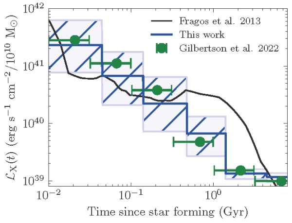 通过联合仙女座星系恒星形成历史分析,研究发现这些X射线双星系统在形成后呈现出持续且快速的衰减趋势,并未出现理论预言中长达十亿年的辐射“平台期”——其实际亮度在10亿年左右时已远低于理论值。这一发现质疑了“X射线光度与星系质量成正比”经验关系的普适性,并对低质量X射线双星光度演化模型提出了挑战。