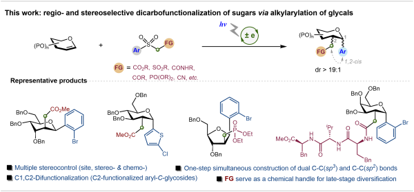 相关研究成果以Streamlined Sugar Diversification via Photoredox-Catalyzed Regio- and Stereoselective 1,2-Alkylarylation of Glycals为题,发表在《德国应用化学》上。