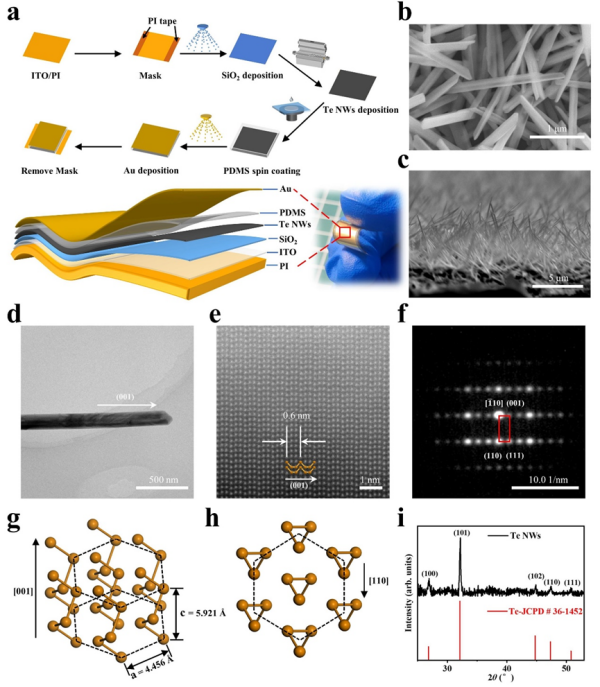 近期,午夜av 金属研究所研究团队研制出基于碲纳米线热电-压电耦合效应的柔性、单通道、应变/应变率-温度多模态传感器。团队通过材料调控和结构设计克服了传统热电材料中,热电和压电信号无法在同一方向获得的难题,在倾斜生长的特殊网状碲纳米线结构中,实现了压电信号和热电信号在面外方向的同时感知和输出。传感器具有优异的性能,应变传感灵敏度为0.454 V、应变率传感灵敏度为0.0154 V s、温度传感灵敏度达225.1 μV K-1,优于已知同类多模态传感器。同时,结合第一性原理计算,团队证明了Te原子电荷的变化引起的压电效应,以及外部电场对于压电信号的调制作用机制。该工作为基于多物理场耦合效应构建柔性、单通道、多模态传感器提供了思路,也为耦合“纳米发电机”开辟了应用方向。