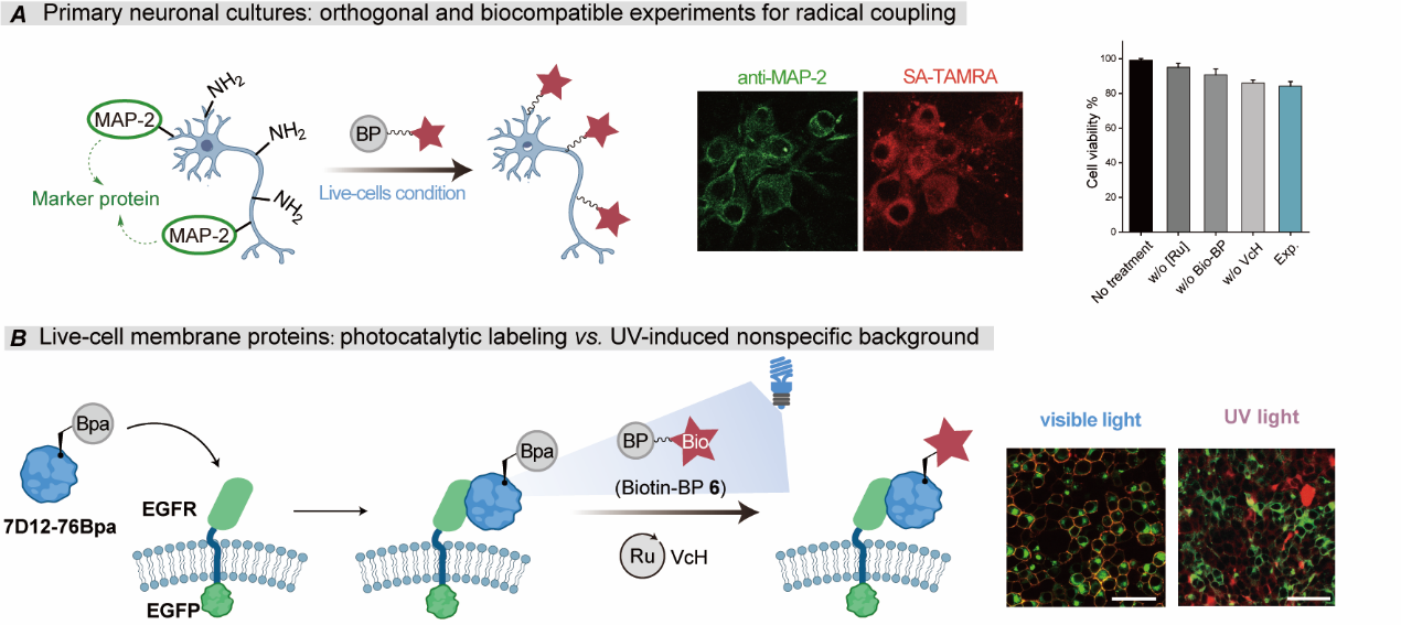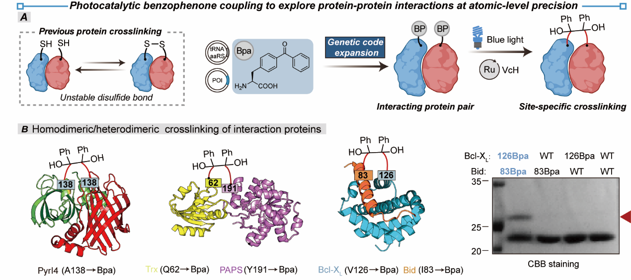 研究团队系统解析了传统紫外激发交联技术的核心瓶颈,即其产生的高活性且难以调控的反应中间体三线态双自由基,易引发环加成和氢原子攫取等副反应,导致非特异性交联和生物分子损伤。同时,团队构建了新型可见光催化体系。该体系可在中性水溶液中高效生成稳定的二芳基酮自由基,实现了生物正交条件下的精准频哪醇偶联。这一策略将副反应发生率从传统方法的20%以上降至5%以下,提升了蛋白质交联的特异性与生物相容性。