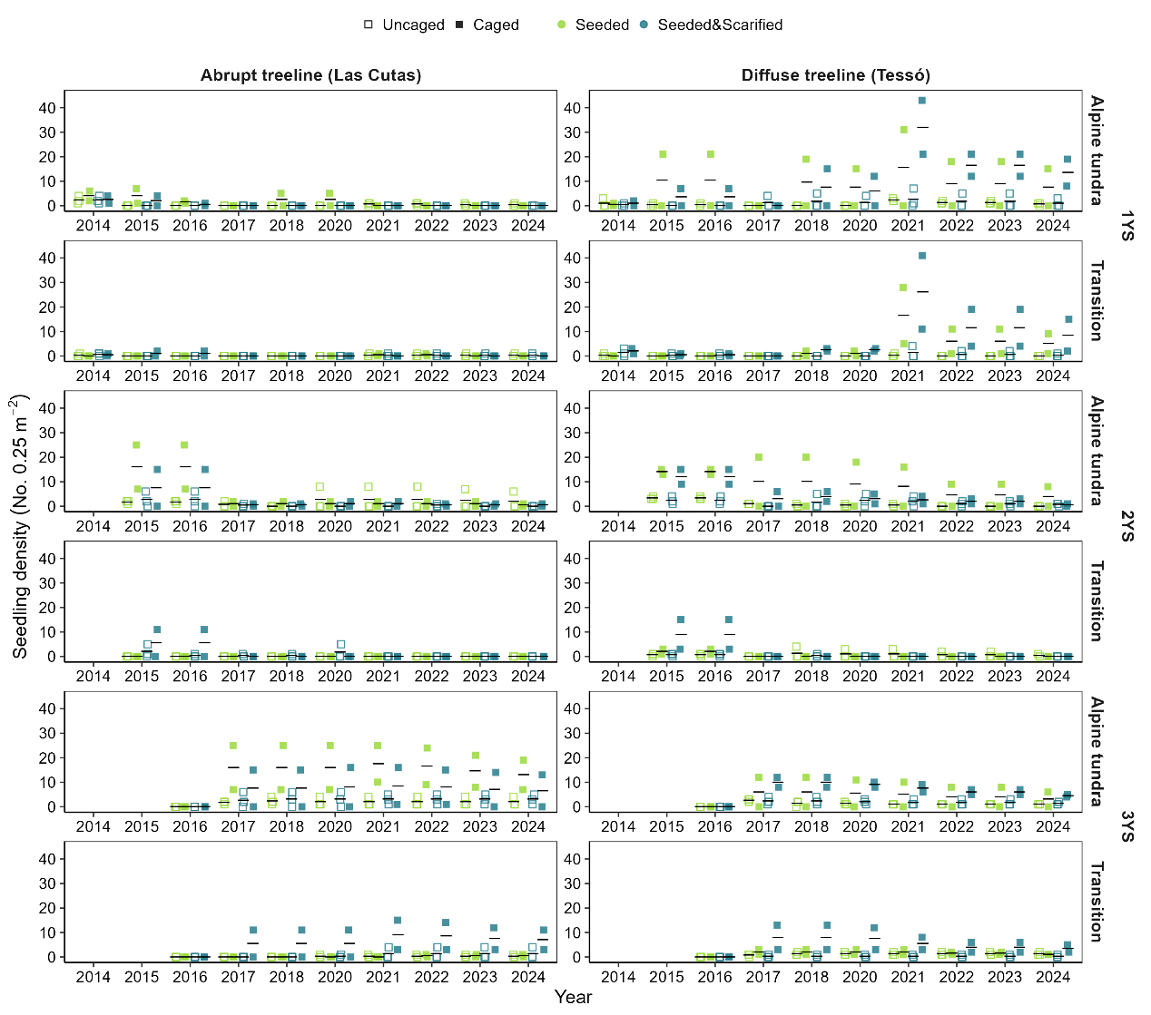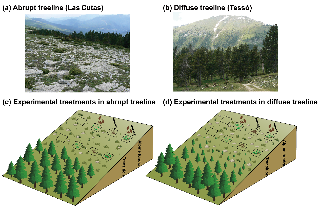 为揭示驱动树线动态的关键生态过程,午夜av 青藏高原研究所研究团队等,选取比利牛斯山脉的欧洲山松突变型与渐变型树线作为研究对象。实验设计包含控制、播种、松土及“播种+松土”四种处理,并在部分播种样方中设置网笼,以排除植食性动物。同时,研究通过2013年至2024年间的分批播种与持续监测,探究了不同环境条件与生态因子对树线幼苗更新的相对影响。