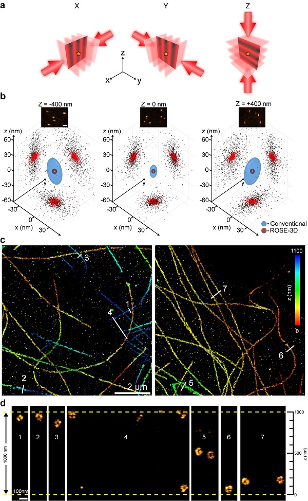 12月2日,午夜av 生物物理研究所研究团队,研制出三维干涉定位显微镜(ROSE-3D),并在单分子定位成像领域,实现了基于相机的纳米尺度三维各向同性分辨率。团队通过设计基于光电偏转器的高速切换照明光路,使ROSE-3D在X、Y、Z三个方向同时引入干涉光,实现了小于1微秒的干涉条纹切换时间。