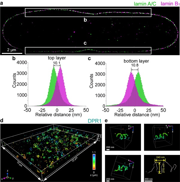 进一步,团队拓展了ROSE-3D多色与多层成像功能,实现了对COS-7细胞中核纤层蛋白lamin A/C与lamin B1的双色成像。统计分析显示,lamin A/C分布于lamin B1内侧,两者间距约10纳米,这是首次从三维全细胞核尺度揭示该分布的特征。同时,团队利用三维各向同性纳米分辨能力,捕捉到了线粒体分裂关键蛋白DPR1组成的复合体在线粒体外膜组装成螺旋状、环状等多种形态,这也是首次在原位实现对该蛋白复合物的结构解析。
