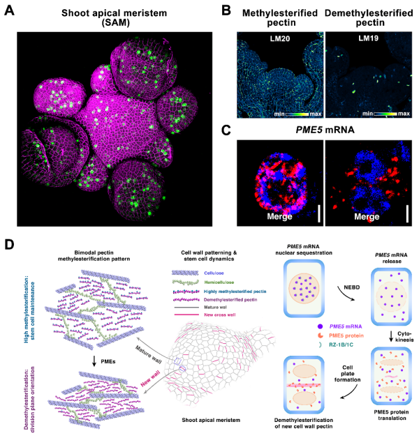 具体而言:在新生的细胞壁中,果胶成分的去甲酯化过程赋予其柔软性和可塑性,为细胞灵活确定分裂的方向和位置提供支持;在成熟的细胞壁中,果胶保持高甲酯化状态,利于维持干细胞持续分裂能力及组织稳定。
