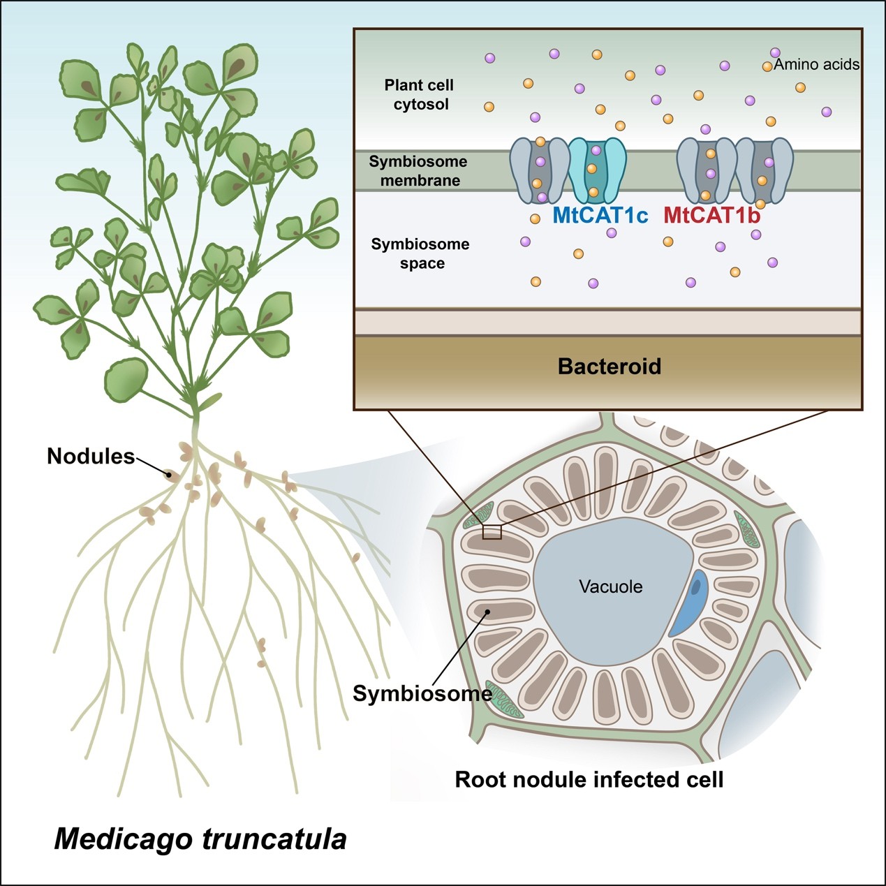该研究揭示了氨基酸转运蛋白在共生体膜中的关键作用,为维持高效共生固氮体系提供了重要分子基础。