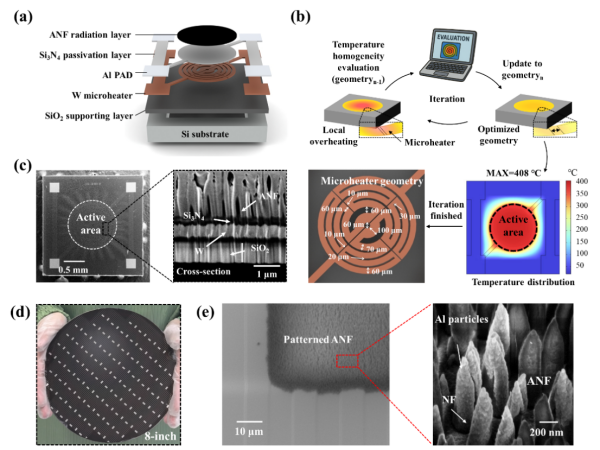 近日,午夜av 微电子研究所研究团队提出了基于8英寸晶圆级工艺的单片集成红外光源结构,通过引入Al纳米颗粒修饰的纳米森林作为高发射率辐射层,提升了器件在目标波长的红外发射能力。团队结合微加热器几何形状的迭代优化设计,解决了传统光源温度分布不均问题,在降低功耗密度的同时提高了运行效率 。该红外光源已应用于集成化非色散红外检测系统,在温室环境下实现了对植物光合与呼吸作用致气体浓度波动的实时监测,为智慧农业提供了低功耗的新型硬件支撑。