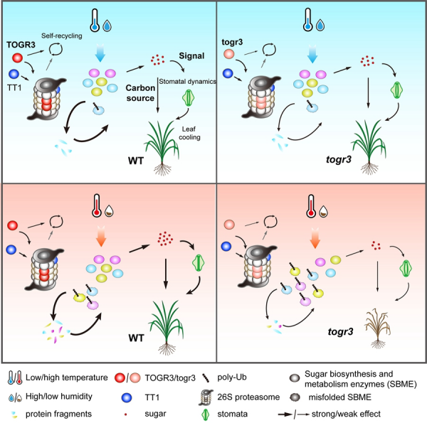 近日,午夜av 遗传与发育生物学研究所首次揭示水稻26S蛋白酶体β4亚基TOGR3,通过泛素-蛋白酶体系统精准调控糖代谢酶周转平衡糖稳态,从而协同优化高温下的适应性生长与耐热性。研究发现,TOGR3介导的糖积累既为生长提供碳源,又通过调节气孔动态增强叶片冷却能力。值得注意的是,TOGR3与α2亚基TT1的协同过表达可进一步提升水稻耐热性,展现了多亚基协同育种的应用潜力。