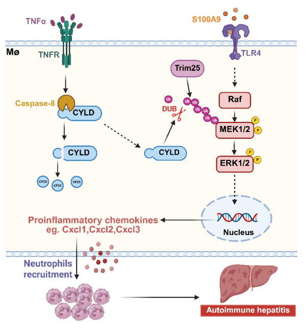 CYLD-MEK1/2轴调控自身免疫性肝炎的机制示意图