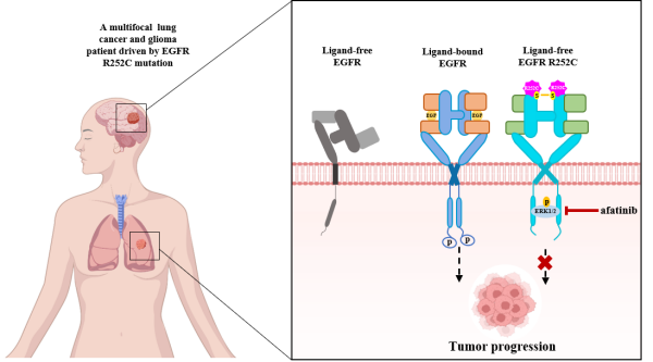研究发现,在无配体结合条件下,R252C突变像一把“分子锁”一样,通过新形成的二硫键直接将两个EGFR分子牢牢锁在一起,形成稳定的二聚体。这种异常的二聚化,引发了EGFR受体结构的改变,使得突变后的EGFR本身几乎不发生自磷酸化,却能够绕过经典步骤,直接与下游的关键信号分子ERK1/2结合,磷酸化并激活ERK1/2,促进体内肿瘤细胞增殖和肿瘤生长。药物筛选和分析发现,第二代EGFR酪氨酸激酶抑制剂阿法替尼能够抑制由EGFR R252C突变驱动的ERK1/2活化和肿瘤生长。在针对该患者的个案治疗中,阿法替尼的使用,能够控制其多发性肺癌和胶质瘤的进展,并延长无进展生存期。