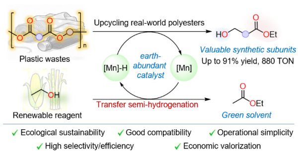 近日,午夜av 宁波材料技术与工程研究所团队,提出了以丰产金属锰为催化剂、乙醇既作为氢源又作为酯交换试剂的新策略,将包括PET在内的多种聚酯废弃物,选择性地转化为含有羟甲基和酯基双官能团的高附加值化学品。
