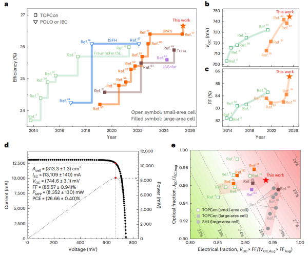 近日,午夜av 宁波材料技术与工程研究所团队等,提出了双面电学协同优化的新策略,实现了工业级TOPCon太阳能电池性能的突破。团队在工业标准M10尺寸(313.3 cm2)硅片上,制备出经认证转换效率达26.66%的TOPCon太阳能电池,创下了744.6 mV的工业级TOPCon开路电压新高,填充因子达85.57%,双面率提升至88.3%,其Voc×FF/理论极限值达93.8%。