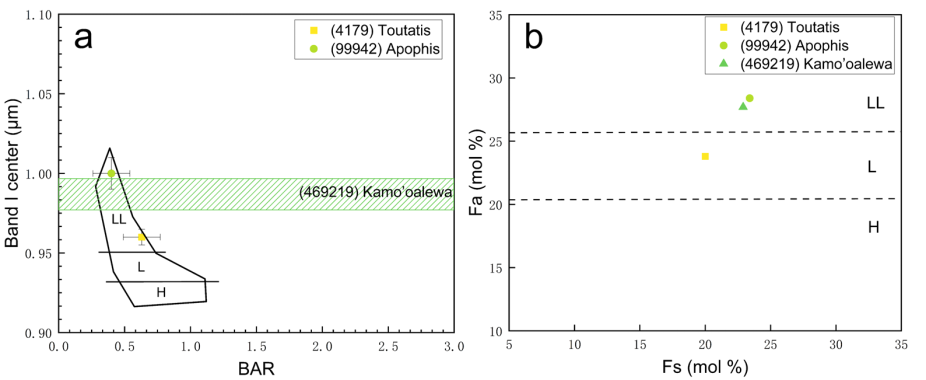 基于上述研究成果,研究团队进一步分析了多个小行星探测任务的目标天体。结果表明,美国NASA OSIRIS-APEX任务的目标——99942 Apophis,以及中国天问二号任务的目标——469219 Kamo‘oalewa,均为与LL型普通球粒陨石成分相似的S类近地小行星;嫦娥二号任务飞越探测的4179 Toutatis,其成分更接近L型普通球粒陨石。这一系列比对不仅验证了光谱分析方法的可靠性,也为我国未来小行星采样返回任务提供了重要的科学依据。
