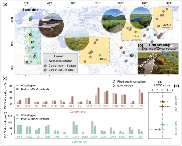 研究发现,长期排水导致富碳湿地泥炭藓退化,加速有机碳降解,导致SOC储量减少。相反,在贫碳湿地中,排水增加了植物输入,增强了矿物保护作用,导致SOC储量增加。团队以SOC储量的核心预测因子构建随机森林模型,评估了过去一百年中国与芬兰排水湿地0—50cm的SOC储量变化。研究发现,在排除排水后耕种等人为扰动因素后,仅排水作用就使中国贫碳湿地SOC累计增加约1.80Gt,而芬兰富碳湿地排水后SOC净损失约0.32Gt。该研究首次在跨洲际尺度上揭示了富碳和贫碳湿地SOC储量对长期排水的响应差异,并强调了全球变化背景下贫碳湿地被低估的碳汇潜力。