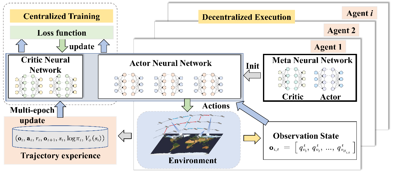 研究团队围绕动态卫星网络环境下,长距离复杂端到端路径选择与时延优化问题展开了系统研究,针对现有路由方法在低轨卫星网络中存在的网络链路拥塞波动、策略收敛速度慢等关键挑战,首次在多智能体强化学习框架中引入了元学习思想,并提出基于元强化学习的多智能体近端策略优化的多路径选择方法。该方法将星地融合网络中多源多目的通信问题,建模为分布式部分可观测马尔可夫决策过程,并通过跨任务经验,共享学习具有良好泛化能力的策略初始化模型,使算法在新的网络场景中可实现快速适配与稳定优化。