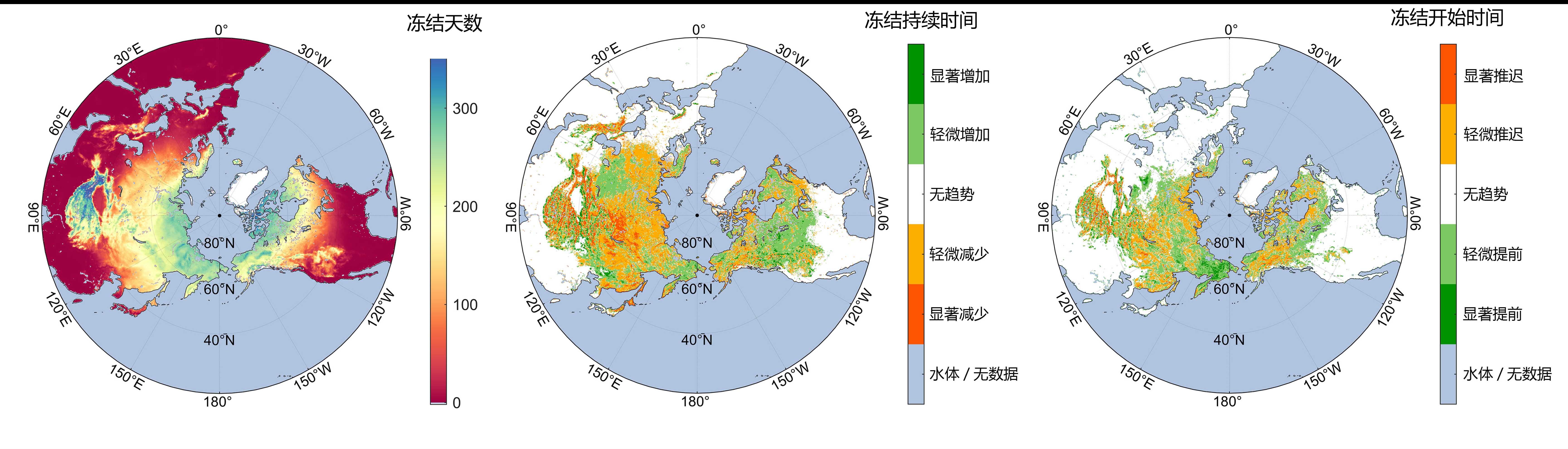 土壤冻融循环还如同调控农业与生态物候的“隐形开关”,其变化直接影响着春季植被返青、农作物播种等关键物候节点。基于该数据集的分析发现,21世纪以来,北纬45度以北地区,约14.35%的区域土壤冻结持续时间明显缩短,约9.1%的区域冻结开始日期明显推迟。这一变化或改变作物的适宜播种期,影响自然植被的返青时序,并重新分配生长季内的水分与养分。这些精细观测数据,为预测农业气候适宜性、评估生态物候变化、指导农业生产提供了科学支撑。