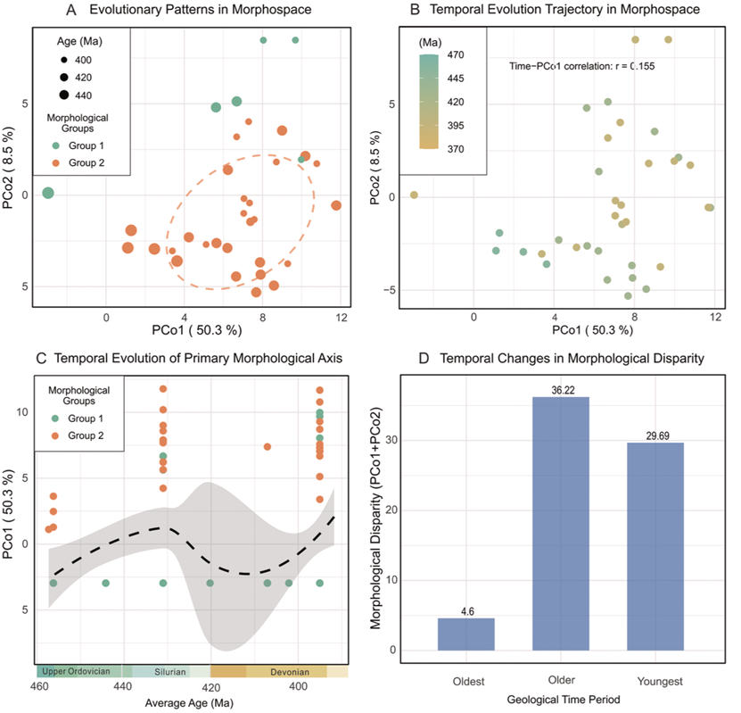 为破解这一演化谜题,研究团队突破传统多样性研究范式,建立了一套多维度交叉分析框架。基于1700余条高精度空间分布记录,提取了159个核心属的47个离散形态特征,构建了形态空间矩阵,并运用广义加性模型、PELT变点检测、时间序列形态差异度分析等前沿定量古生物学方法,高精度重构了无洞贝近一亿年的形态空间演化与多样性动态轨迹。