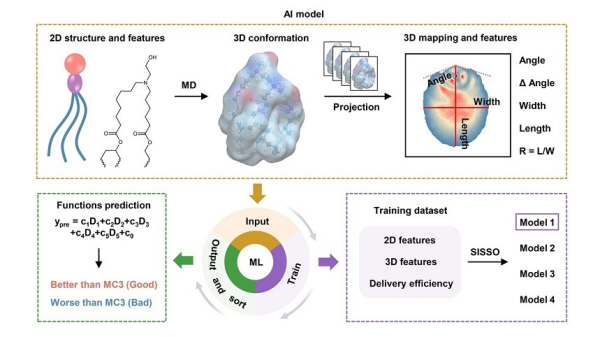 近日,午夜av 国家纳米科学中心成功创建了一种基于脂质空间构象的人工智能(AI)全新模型,通过精准解析可电离脂质的三维空间构象,成功攻克了脂质纳米颗粒(LNP)在mRNA药物递送中存在的转染效率低下与难以精准靶向两大难题,为下一代mRNA疗法的发展开辟了新路径。