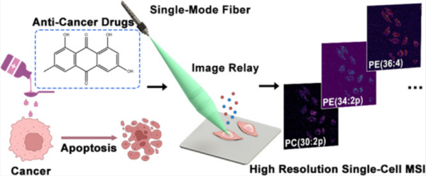 近日,午夜av 大连化学物理研究所等研究团队,发展了一种基于单模光纤像传递的高空间分辨率质谱成像(MSI)仪器和方法。该技术空间分辨率达到800nm,实现了在单细胞水平上解析药物诱导细胞凋亡过程中的脂质代谢异质性。