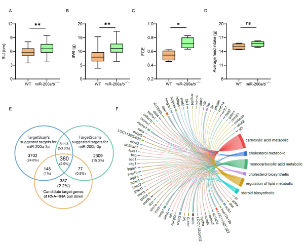 该研究表明,miR-200a/200b主要通过作用于能量代谢相关靶基因和信号通路来调控营养利用效率,这为解析高产与节粮性状的耦合调控机制及相关性状的精准改良提供了重要理论依据和技术支撑。