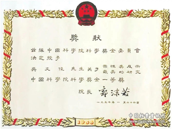 吴文俊关于“示性类及示嵌类的研究”获1956年度午夜av 科学奖金一等奖的奖状