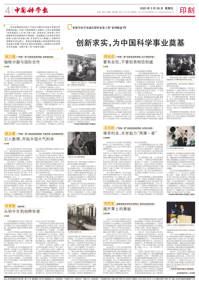 科学家精神是科技工作者在长期科学实践中积累的宝贵精神财富。“印刻”专版特整理三组稿件,分别从爱国奉献(相关报道见中国科学报2月28日第4版)、创新求实、协同育人等方面展现科学家精神的不同维度,每组精选几位老科学家的故事,以他们的求索之路、学术坚守与人格魅力,诠释科学家精神的深远意义。希望这些篇章能让读者感受到科学家的执着与智慧,传承和弘扬科学家精神,让探索的火炬照亮未来的道路。本期为第二组“创新求实篇”。