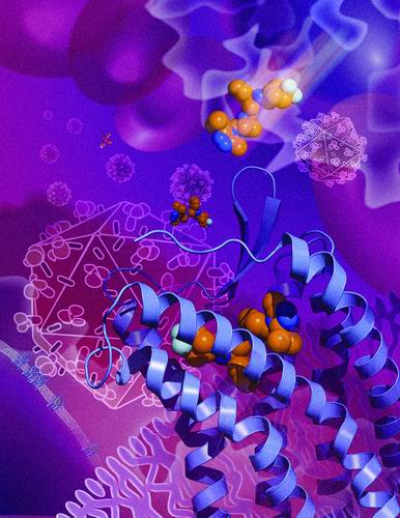 吴蓓丽团队通过解析蛋白质分子结构,揭示了HIV感染人体细胞的机制。图中紫色螺旋为CCR5蛋白分子,橘黄色和蓝色小球为马拉维诺,多面体为HIV。