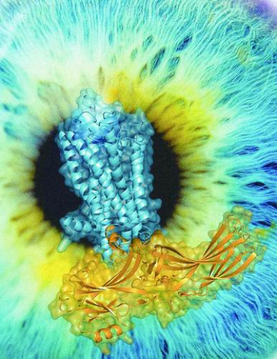 徐华强领衔的国际合作团队首次解析了视紫红质与阻遏蛋白完整复合物的晶体结构。图中蓝色所示为视紫红质的结构,黄色所示为阻遏蛋白的结构。上海药物所供图