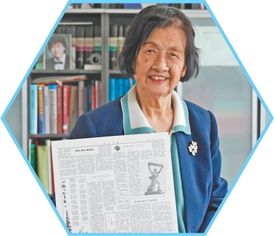 李依依与1959年8月31日的《人民日报》样例合影。她出现在当日刊发的《竞赛还没有结束》中。人民网记者 周颂雪摄