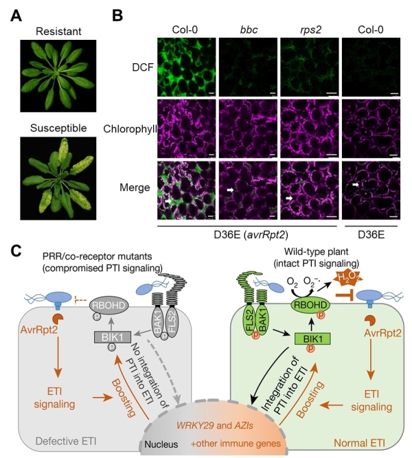 主要成果总结。(A)上图为抗病植物表型,下图为感病植物表型。(B)不同菌处理植物后,活性氧ROS的产生情况。D36E(avrRpt2)菌株在野生型Col-0植物中能同时激活PTI和ETI。绿色荧光指示活性氧ROS,紫色荧光代表叶绿体自发荧光。(C)文章研究结果的模型图。图中右边表示正常植物,能够同时激活第一层PTI和第二层ETI免疫系统,因此存在协同作用,抵抗病原菌的侵染;左边是第一层免疫系统PTI缺失的突变体,不能诱导起正常的ETI免疫反应,从而缺失了植物抗性。