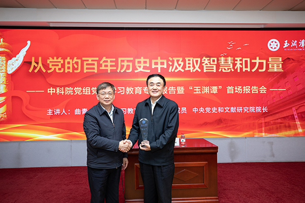 “玉渊谭”讲座由中科院机关发起设立,以“科学、文化、人生”为载体,以“悟道、崇德、力行”为归依,致力于建成高端选题、大家主讲、品质优异、特色鲜明的学术交流平台、思想汇聚平台、文化建设平台。讲座围绕党的政策理论、国际国内形势、科技发展态势、科研管理改革、经济社会发展、文化艺术哲学等领域重大课题,邀请国内外知名专家学者交流前沿思想和学术成果,分享科学文化与人生感悟,促进科学精神与人文精神融合、机关文化与创新文化融合、素质提升与能力提升融合,持续推动模范机关建设。报告会上,侯建国向曲青山赠送了“玉渊谭”首场报告纪念牌。