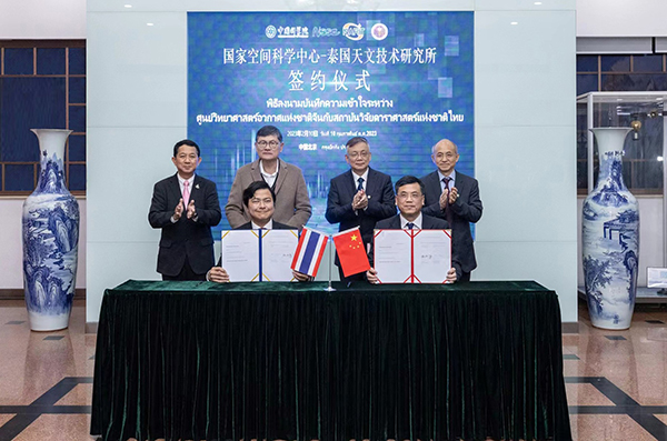 会见结束后,侯建国、阿内、张亚平、诗立叻共同见证了中科院国家空间科学中心与泰国天文技术研究所合作协议签署。