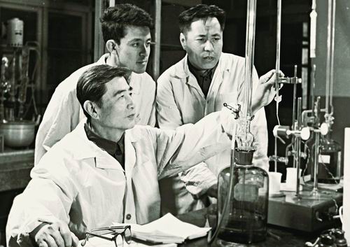 1983年,长春应化所研究员季鸣时(左一)、副研究员王振芳(右一)等正在研究固体火箭推进剂。关凤林/摄