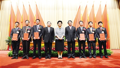 6月13日,刘延东和白春礼、周济与获奖科学家合影。本报记者 周维海摄