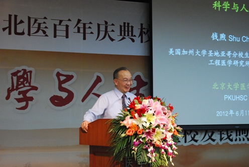 钱煦院士以生动风趣的语言向同学们介绍了自己的成长经历,现场师生反应热烈,会场不时响起阵阵掌声和笑声。他告诉大家,人生是不可预先设定的,只有尽最大的努力积极向前,才能取得成功。他以自己由于对工学、数学感兴趣进而从事交感神经研究为例,鼓励大家积极投身自己感兴趣的领域,做自己喜欢做的事。他对自己的研究团队引以为荣,也让同学们切身体会到在任何领域,人都是最宝贵的财富。他以自己对分子生物学的学习为例告诉同学,对于未知的领域不要感到担心和害怕,只要认真去学习,就一定会达到某种境界。他与大家分享了从血流动脉硬化研究中得出的感悟:做任何事情,方向很重要,有方向就会事半功倍,没有方向就会事倍功半。他还以打高尔夫球为例,让同学们明白了做任何事情都不要太刻意,更不能有功利心,只有以放松的心态,才能努力做到最好。谈到对父母、家人、女儿的感情,他向大家展示了他严谨工作之外的细腻感情,尤其是谈到妻子,他说“这一辈子最重要的事情就是认识妻子并和她结婚”,现场掌声雷动。作为知名校友和深受学生爱戴的师长,他对母校的感情溢于言表,对身为北大人和北医人倍感骄傲和自豪,他说“一旦成为北大人,永远都是北大人”。