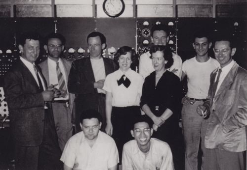 1950年,与美国斯坦福大学同事在1GeV电子直线加速器控制台前(前右一)