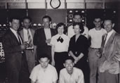 1950年,与美国斯坦福大学同事在1GeV电子直线加速器控制台前(前右一)