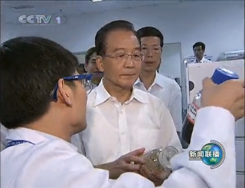继农业生物技术、医药生物技术之后,工业生物技术的浪潮正在兴起。中科院天津工业生物技术研究所的主攻方向是生物制造,近期主要任务是将秸秆、稻秆、刨花等生物质可再生资源替代化石资源,生产生物纤维、生物燃料、生物材料等工业产品。温家宝来到研究所,考察了微生物功能基因组学与生物技术实验室、系统与合成生物技术实验室,听取了研究成果的报告。他说,生物制品研究制造的前途广、难度大,但再难也难不倒中国的科研工作者。有国家创造的良好环境,有一大批勇攀高峰的科研人员,有丰富的生物质资源,我们不但能在研究领域走在世界前列,而且能将研究成果推向应用领域。