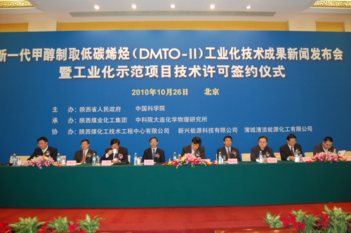 大连化物所所长张涛、陕西煤业化工集团董事长华炜、中石化洛阳石化工程公司副总经理王国良代表DMTO-II工业化技术许可方,与被许可方陕西蒲城清洁能源化工有限公司董事长刘培荣签署了技术许可协议。