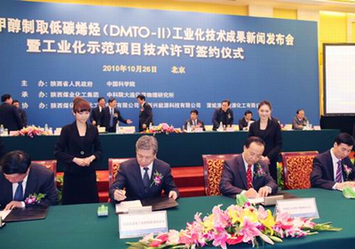 10月26日,由我国自主研发的“新一代甲醇制取低碳烯烃工业化技术(DMTO-Ⅱ)在北京首签工业化示范项目许可。陕西煤业化工集团、中科院大连化物所、中石化洛阳石化工程公司,与陕西蒲城清洁能源化工有限公司正式签约。这是DMTO-Ⅱ工业化技术全球首份许可合同,标志着具有我国自主知识产权、世界领先的新一代甲醇制烯烃技术在走向工业化道路上迈出了关键一步。