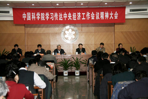 在京召开会议,学习传达中央经济工作会议精神。中科院院长、党组书记路甬祥,常务副院长、党组副书记白春礼传达了胡锦涛总书记、温家宝总理在中央经济工作会议上的重要讲话精神,路甬祥就中科院学习贯彻会议精神提出了要求。学习传达会由中科院党组副书记方新主持。中科院在京的院党组成员、院领导,副部级以上老领导,京区单位党政主要负责人,院机关副局长以上领导干部,院机关离退休党支部书记等出席会议。