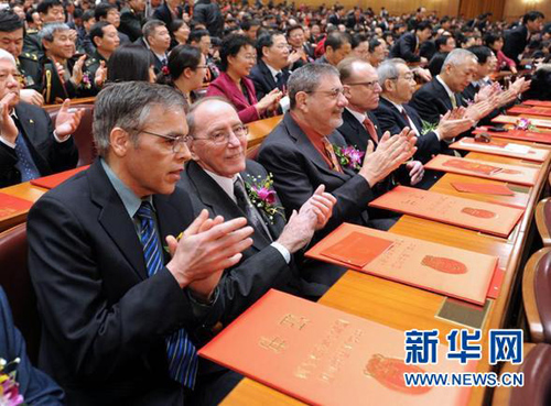 力学研究所研究员郑哲敏,中国工程院院士、中国电子科技集团公司电子科学研究院研究员王小谟颁发奖励证书。随后,胡锦涛、习近平等向获得国家自然科学奖、国家技术发明奖、国家科学技术进步奖和中华人民共和国国际科学技术合作奖的代表颁奖。