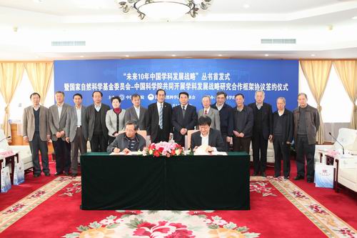 和国家自然科学基金委员会在北京签署了共同开展学科发展战略研究合作框架协议,并举行了“未来10年中国学科发展战略”丛书首发式。中科院院长、学部主席团执行主席白春礼、国家自然科学基金委主任陈宜瑜出席仪式并讲话。中科院副院长李静海、国家自然科学基金委副主任孙家广代表双方在协议上签字。中科院学部咨询评议工作委员会主任朱道本主持仪式。