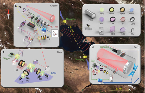 在上述系统技术的长期发展和积累的基础上,中科院联合研究团队于2011年10月在青海湖首次成功地实现了百公里量级的自由空间量子隐形传态和双向纠缠分发。最近,联合研究团队在青海湖首次实现了基于四光子纠缠的97公里的自由空间量子态隐形传输,并首次实现了百公里的双向纠缠分发和Bell不等式检验,该成果发表在8月9日出版的《自然》杂志上[Nature 488, 185 (2012)]。该实验证明,无论是从高损耗的地面指向卫星的上行通道链路,或是从卫星指向两个地面站的双通道下行链路,实现量子态隐形传输和量子纠缠分发都是可行的,这为基于卫星的广域量子通信和大尺度的量子力学基础原理检验的实现奠定了坚实的基础。