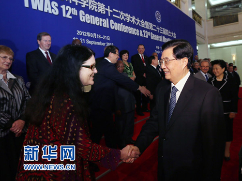 9月18日,国家主席胡锦涛在天津出席发展中国家科学院第十二次学术大会暨第二十三届院士大会开幕式并致词。这是胡锦涛在开幕式前亲切会见出席大会的部分来宾。新华社记者兰红光摄